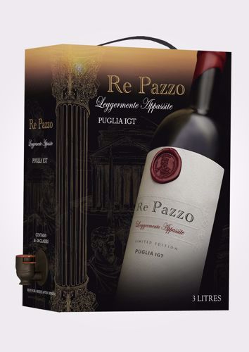 Re Pazzo ”Skør Konge” er en rund ogfyldig vin delvist lavet efterAppassimento metoden. De tørrededruer fra Puglia, giver vinen en letsødme og behagelig smag af blommerog rosiner.Perfekt til oksekød, pastaretter, pizza,koteletter, lam og ost.